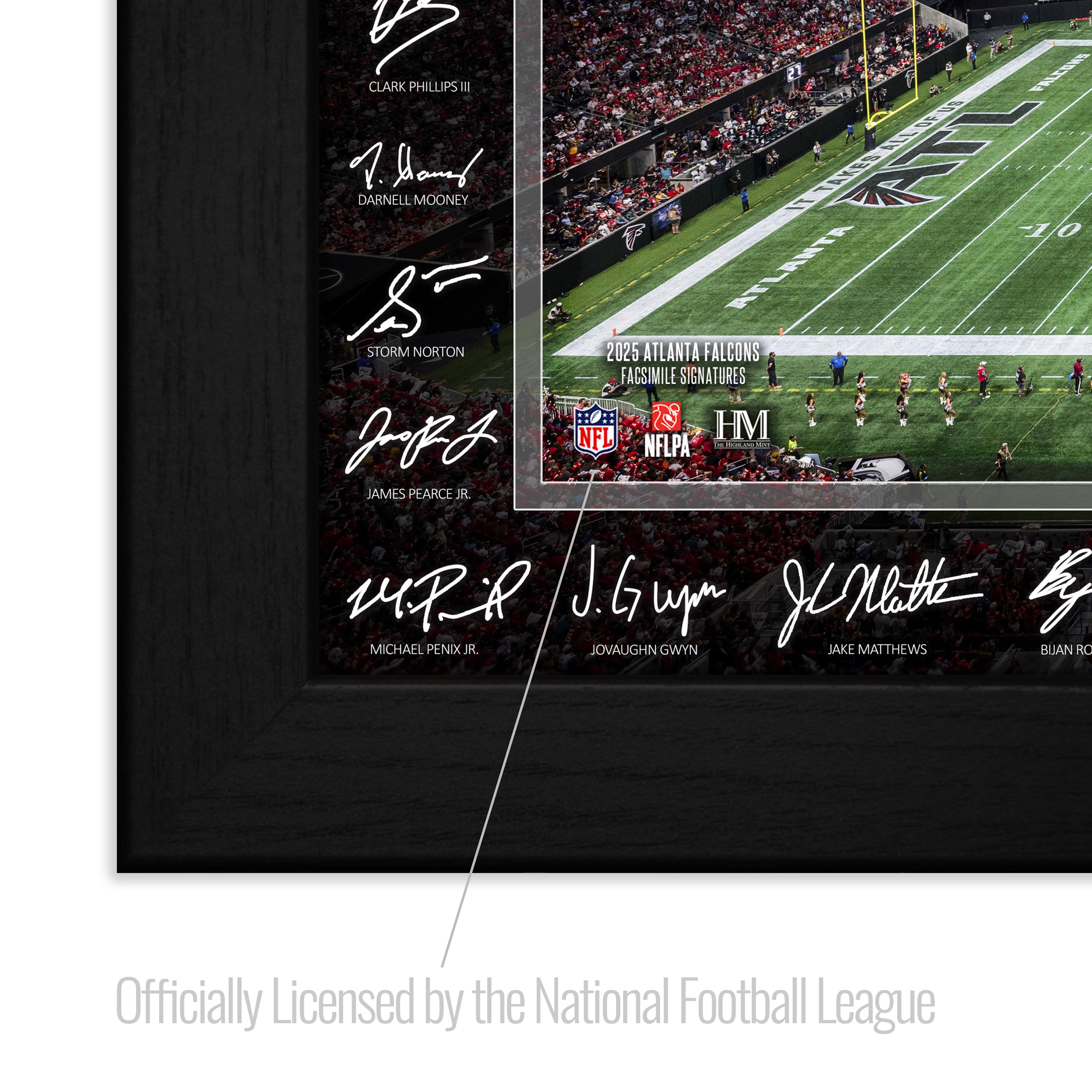 This unique 12"x20" Signature Gridiron frame showcases an individually hand-numbered print of the Atlanta Falcons home field, surrounded by the facsimile (replica) signatures of most of the 2025 team roster. Elegantly presented under acrylic glass, this officially licensed collectible is a limited edition of only 5,000 — each accompanied by a certificate of authenticity. Proudly made in the U.S.A. by The Highland Mint!