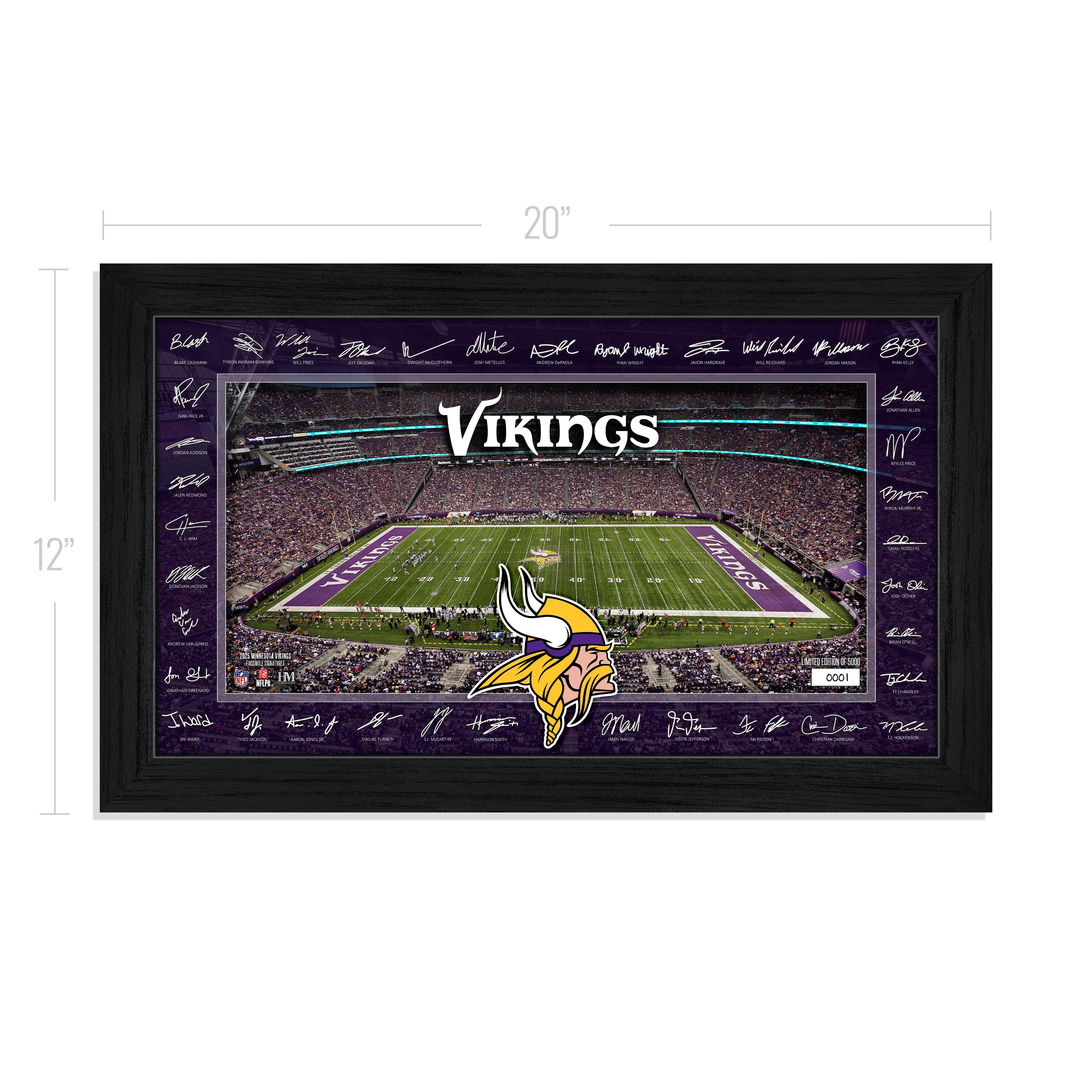 This unique 12"x20" Signature Gridiron frame showcases an individually hand-numbered print of the Minnesota Vikings home field, surrounded by the facsimile (replica) signatures of most of the 2025 team roster. Elegantly presented under acrylic glass, this officially licensed collectible is a limited edition of only 5,000 — each accompanied by a certificate of authenticity. Proudly made in the U.S.A. by The Highland Mint!