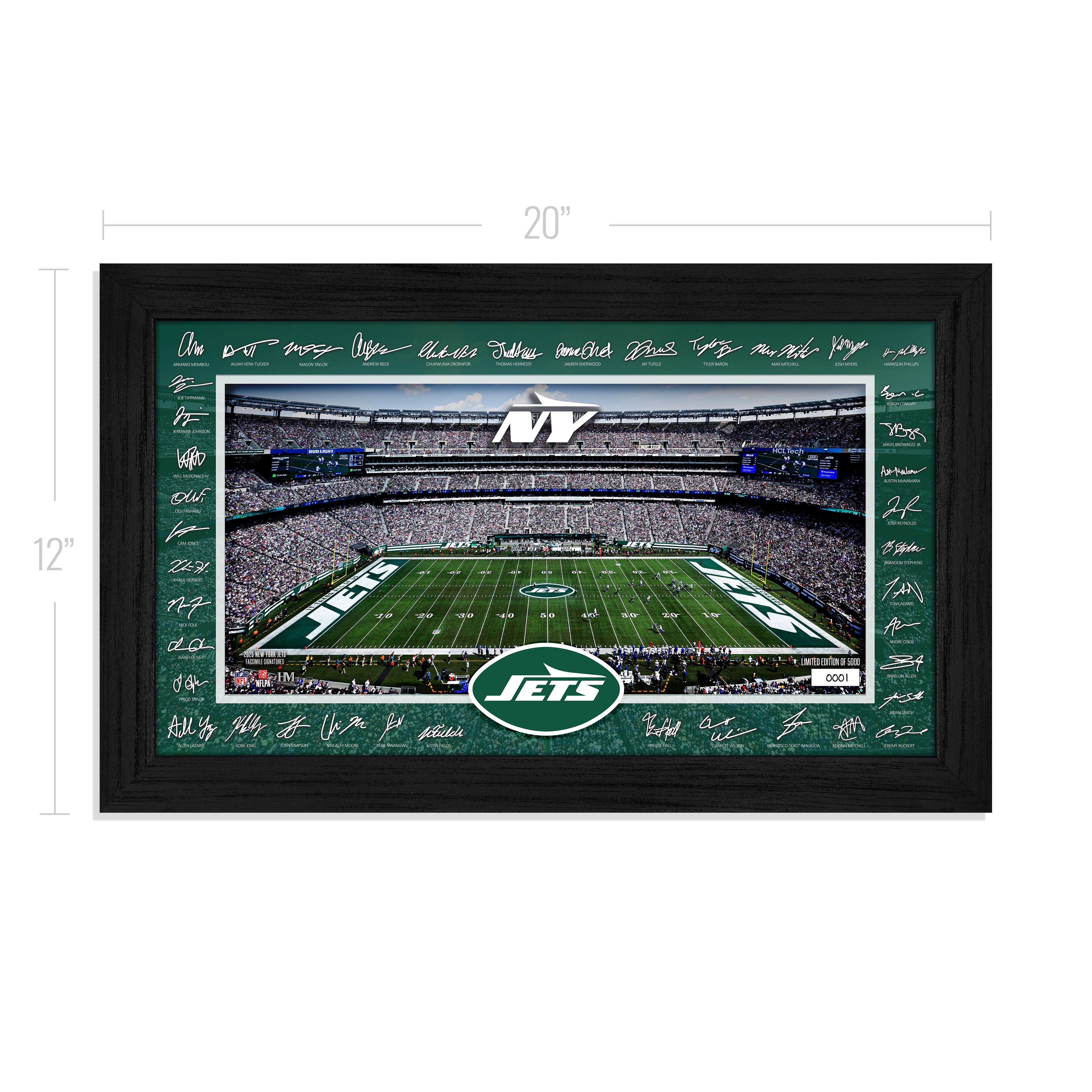 This unique 12"x20" Signature Gridiron frame showcases an individually hand-numbered print of the New York Jets home field, surrounded by the facsimile (replica) signatures of most of the 2025 team roster. Elegantly presented under acrylic glass, this officially licensed collectible is a limited edition of only 5,000 — each accompanied by a certificate of authenticity. Proudly made in the U.S.A. by The Highland Mint!