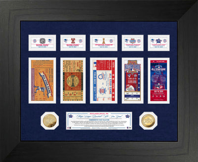 A limited edition of only 1000! Featured in a black 22" x 18" wood frame with 2.5" wide molding and double matting is the Philadelphia Phillies commemorative World Series ticket collection! This collectible frame is highlighted with a gold plate 39mm team coin and a gold plate 39mm Multi Champ coin. Also matted in the frame are engraved nameplates and die cut team logos. Each frame has an individually numbered certificate of authenticity adhered to the back. Officially licensed by the MLB and proudly made in the U.S.A by The Highland Mint!