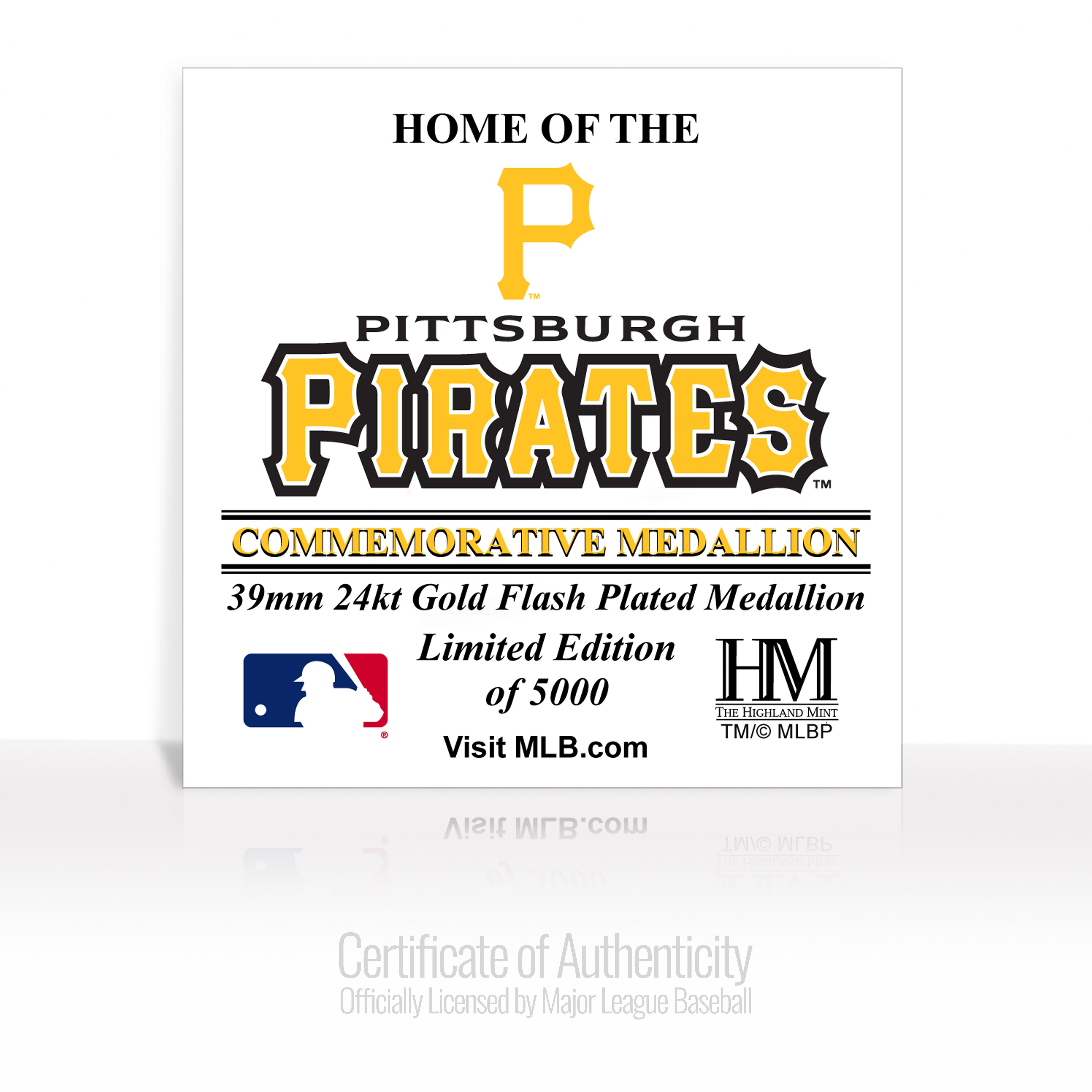 A 39mm minted MLB Stadium commemorative coin with the team logo on the reverse is minted and flash plated with 24KT gold and is delivered in a black velour jewelry box. Each coin is protected in a capsule to preserve its condition and accompanied by an individually numbered certificate of authenticity. Officially licensed by MLB and proudly made in the USA by The Highland Mint.