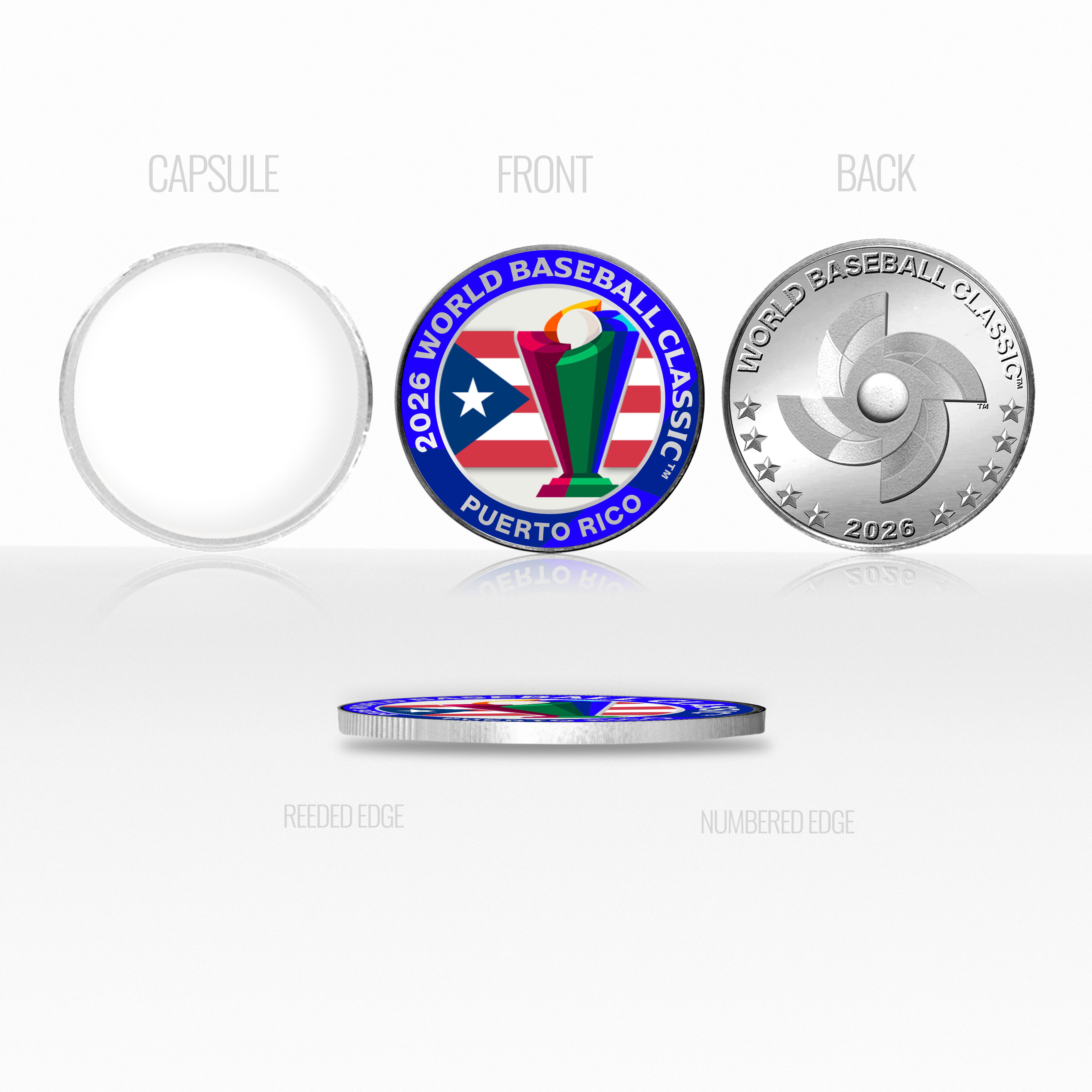 The coin features the Puerto Rican flag alongside the official World Baseball Classic emblem, symbolizing both heritage and the thrill of competing with the world’s best.