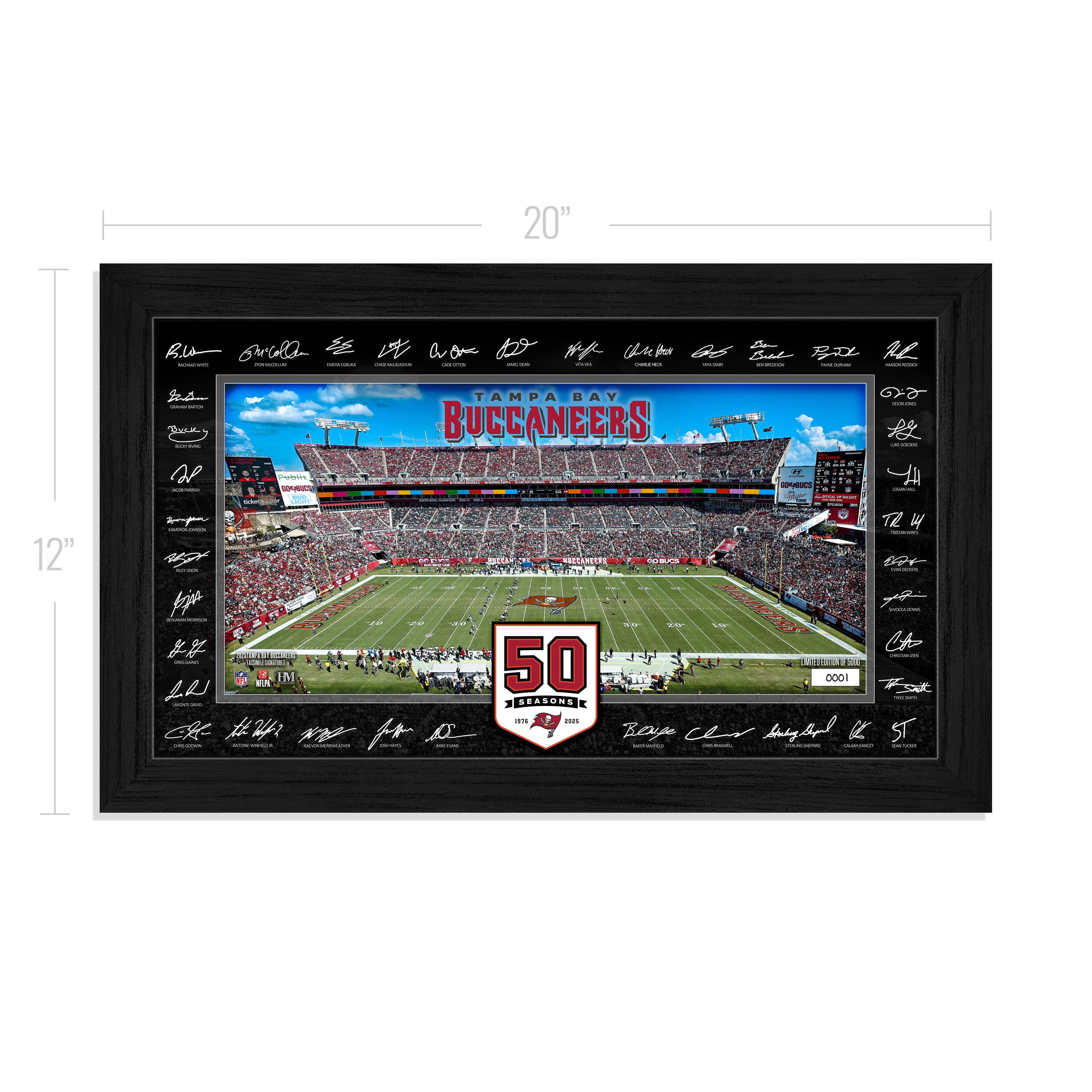 This unique 12"x20" Signature Gridiron frame showcases an individually hand-numbered print of the Tampa Bay Buccaneers home field, surrounded by the facsimile (replica) signatures of most of the 2025 team roster. Elegantly presented under acrylic glass, this officially licensed collectible is a limited edition of only 5,000 — each accompanied by a certificate of authenticity. Proudly made in the U.S.A. by The Highland Mint!
