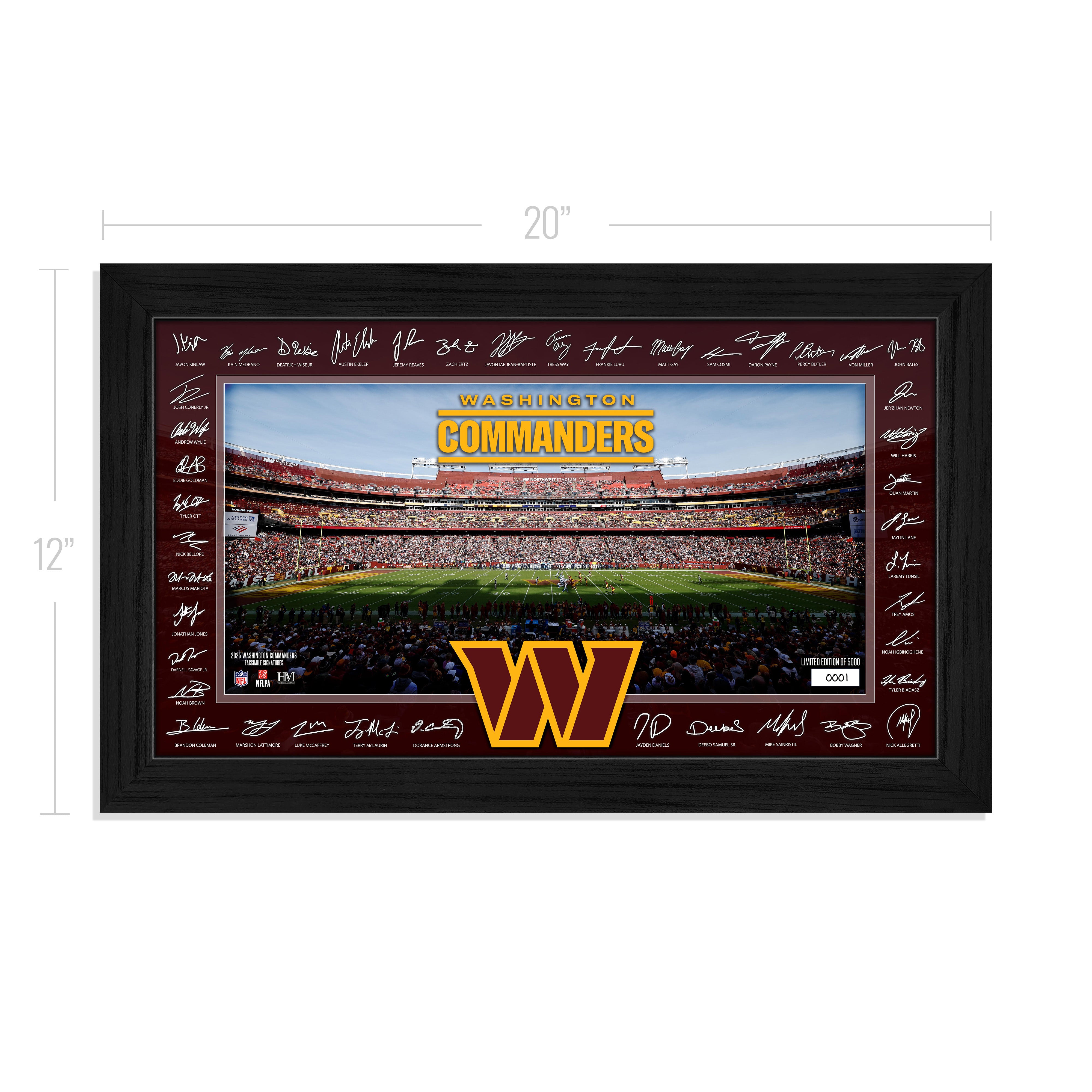This unique 12"x20" Signature Gridiron frame showcases an individually hand-numbered print of the Washington Commanders home field, surrounded by the facsimile (replica) signatures of most of the 2025 team roster. Elegantly presented under acrylic glass, this officially licensed collectible is a limited edition of only 5,000 — each accompanied by a certificate of authenticity. Proudly made in the U.S.A. by The Highland Mint!